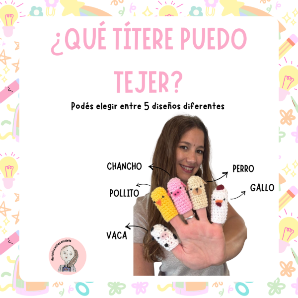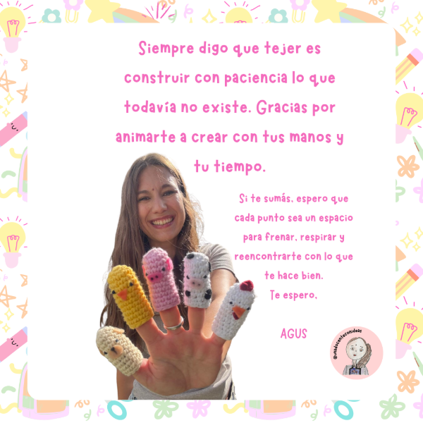 El primer crocheteando del año se llama “mi primer títere tejido”, en el que te iniciarás en puntos básicos: nudo deslizado, cadeneta, punto básico, punto deslizado. Con estos puntos vamos a crear juntas un dedil tejido, ideal para cuentos, juegos y propuestas lúdicas.