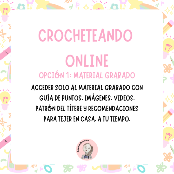 Todo está grabado con explicaciones simples y primeros planos para que puedas pausar, repetir y practicar a tu ritmo. Todas las imágenes y videos se encuentran disponibles con mano hábil derecha y con mano hábil izquierda, para que puedas tejer mirando e imitando los movimientos, dependiendo tu mano hábil. Tanto la modalidad presencial como la online incluye un PDF con imágenes de cada punto, paso por paso, guía de puntos con sus símbolos, nombres y abreviaturas, recomendaciones para principiantes, videos explicativos, el patrón del títere y el video para que lo hagas en tu casa.