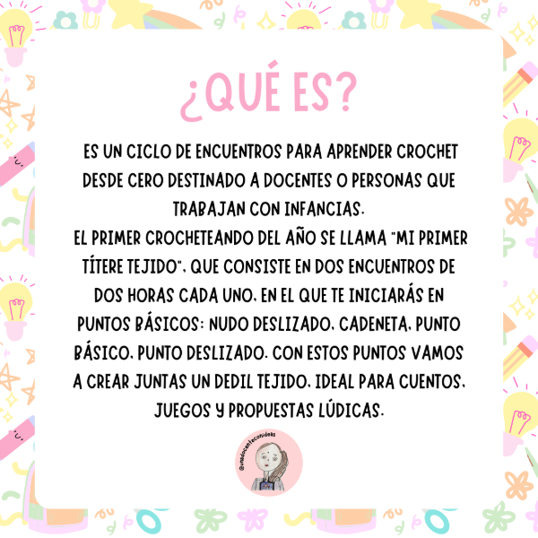 Crocheteando es un ciclo de encuentros para aprender crochet desde cero destinado a docentes o personas que trabajan con infancias.