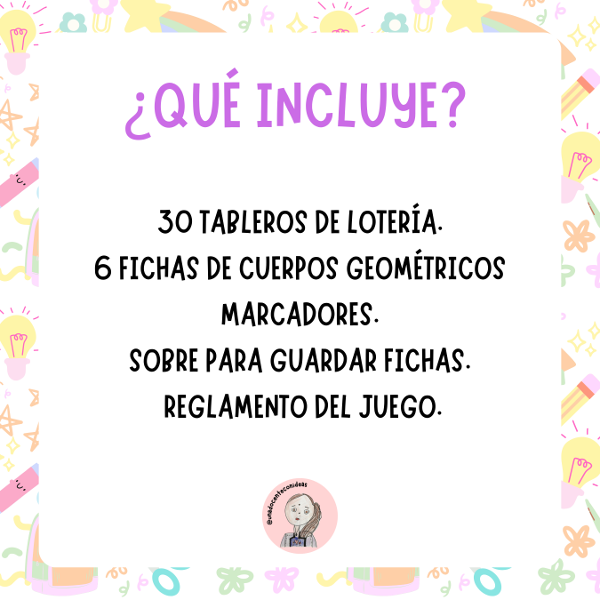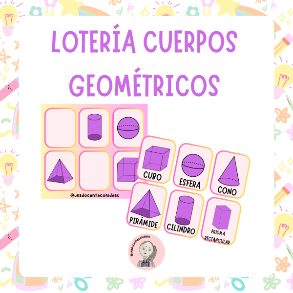 La "Lotería de cuerpos geométricos" es una herramienta educativa perfecta para que los niños y niñas aprendan a identificar y diferenciar formas tridimensionales como cubos, cilindros, esferas, y más. Ideal para utilizar en el aula o en casa, este juego no solo refuerza el conocimiento matemático, sino que también estimula la observación, la memoria y la concentración. Cada tarjeta presenta un cuerpo geométrico ilustrado con colores vibrantes, junto con su nombre para un aprendizaje más completo. ¡Una forma divertida y educativa de explorar la geometría!